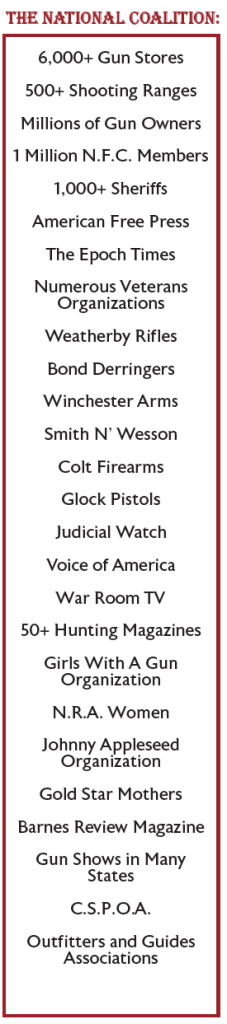 If you’re an FFL license holder Please Note: The N.F.C. will help defend you and/or your business from any alphabet agency or agent that targets you for harrassment and persecution. Such activity is unconstitutional and in violation of oaths of office — a felony by Federal Statute. Our team of highly capable attorneys and paralegals stands ready to assist our members in the filing of criminal complaints with your agitators, (be they low-level F.B.I./A.T.F. agent lackeys or their U.S. Attorney bosses), wherein the malefactors in question will be named, prosecuted, and subjected to a $10,000 fine and even jail time!